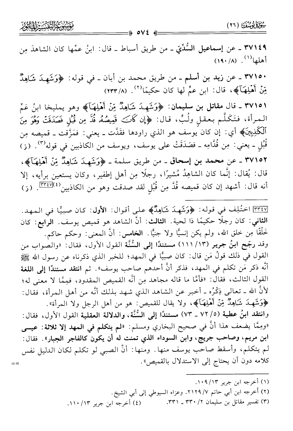 [٣٣٤٧] اختُلِف في قوله: {وشهد شاهد} على أقوال: الأول: كان صبيًّا في المهد. الثاني: كان رجلًا حكيمًا ذا لحية. الثالث: أنّ الشاهد هو قميص يوسف. الرابع: كان خَلْقًا مِن خلق الله، ولم يكن إنسيًّا ولا جنيًّا. الخامس: أنّ المعنى: وحكم حاكم.