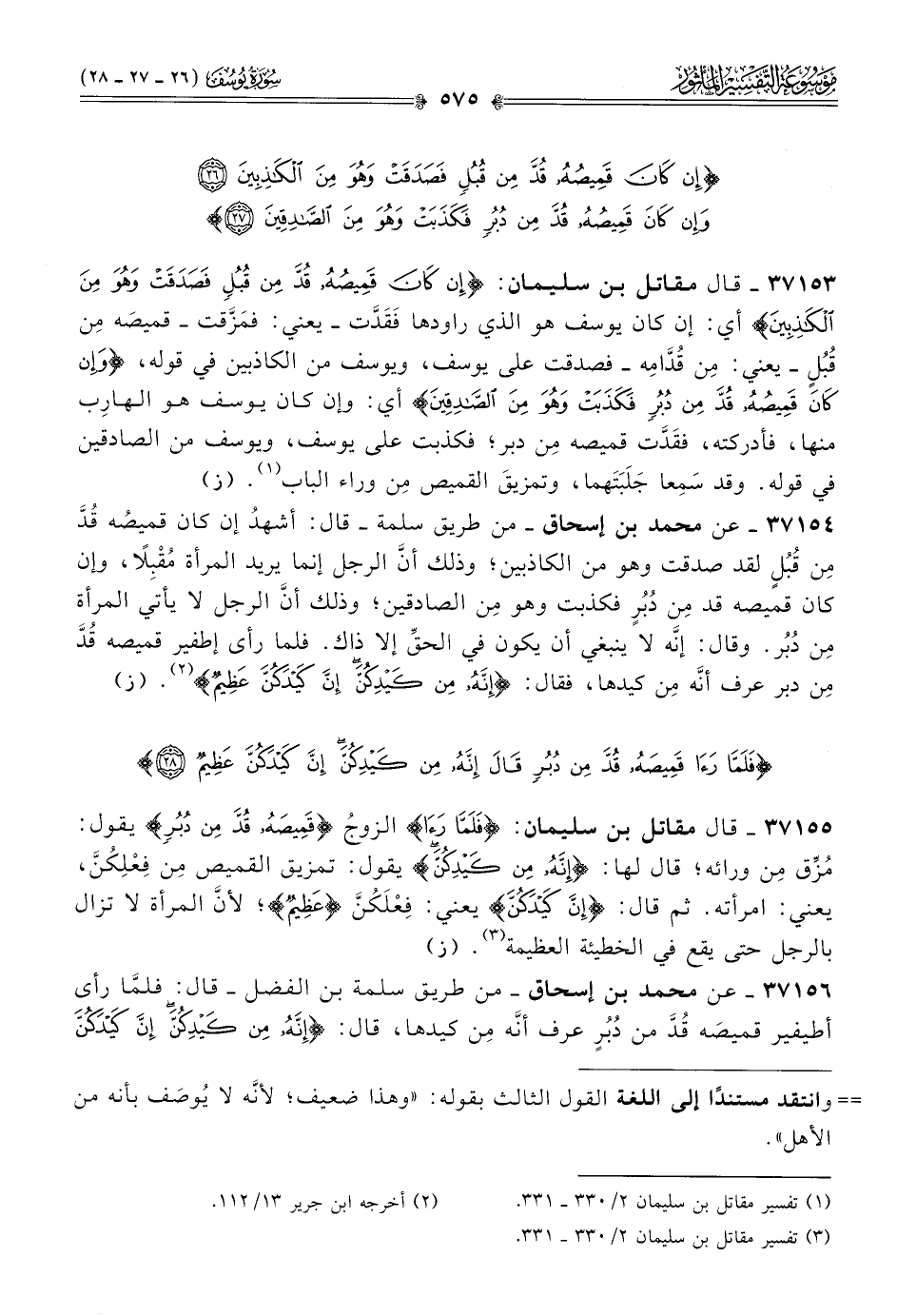 ٣٧١٥٦ - عن محمد بن إسحاق -من طريق سلمة بن الفضل- قال: فلمّا رأى أطيفير قميصَه قُدَّ من دُبُرٍ عرف أنّه مِن كيدها، قال: {إنه من كيدكن إن كيدكن