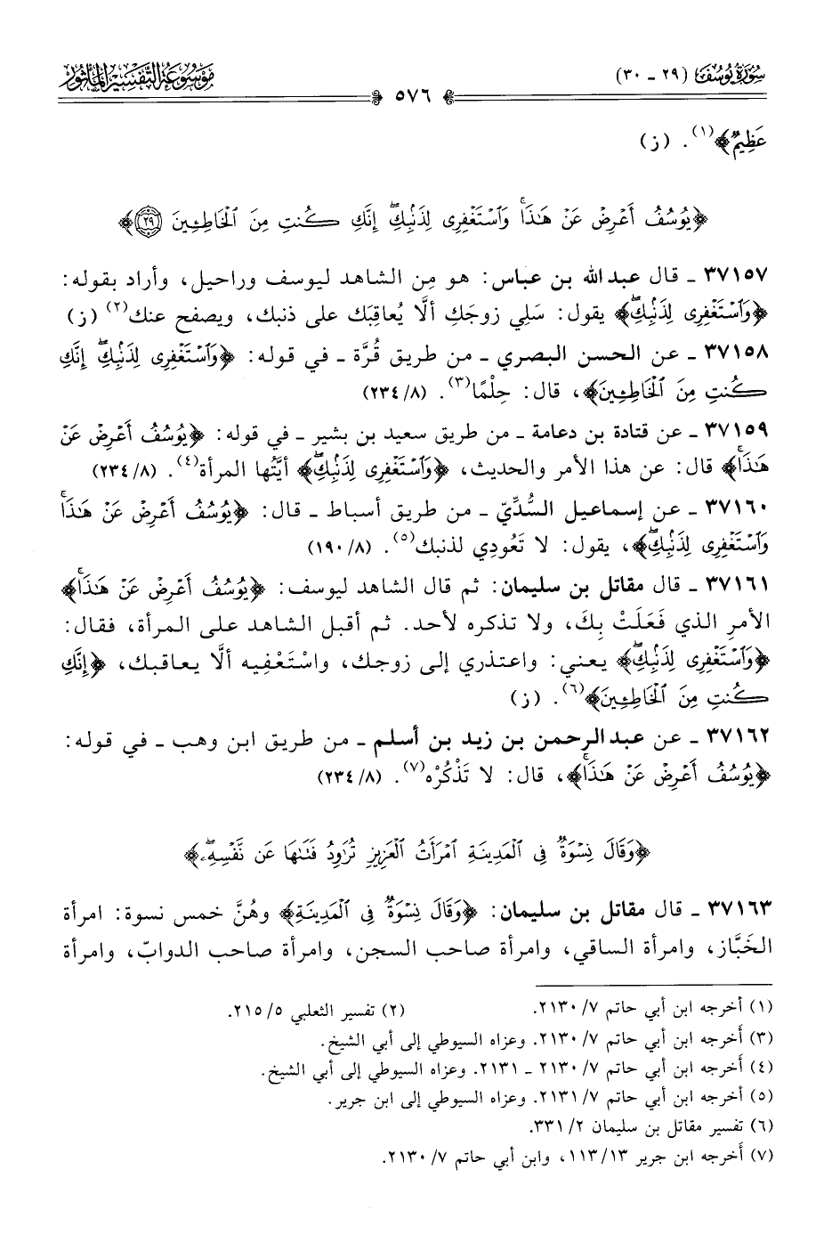 ٣٧١٥٩ - عن قتادة بن دعامة -من طريق سعيد بن بشير- في قوله: {يوسف أعرض عن هذا} قال: عن هذا الأمر والحديث، {واستغفرى لذنبك} أيَّتُها المرأة (¬٤). (٨/ ٢٣٤)