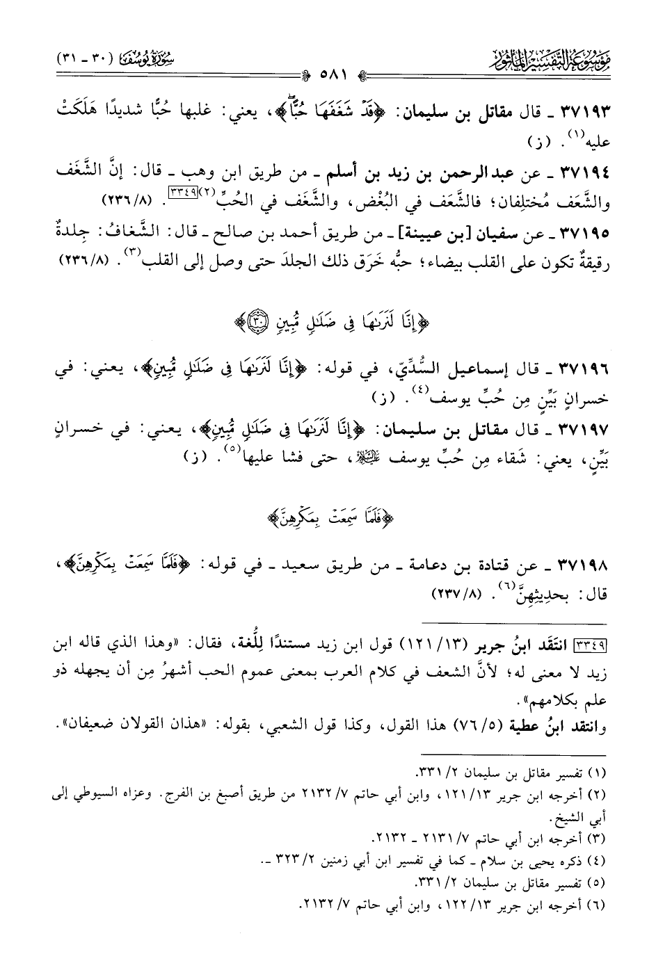 [٣٣٤٩] انتَقَد ابنُ جرير (١٣/ ١٢١) قول ابن زيد مستندًا لِلُّغة، فقال: «وهذا الذي قاله ابن زيد لا معنى له؛ لأنّ الشعف في كلام العرب بمعنى عموم الحب أشهرُ مِن أن يجهله ذو علم بكلامهم».