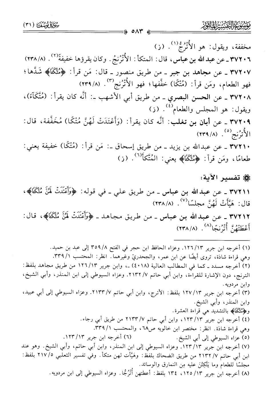 ٣٧٢٠٦ - عن عبد الله بن عباس، قال: المتكأ: الأُتْرُنجُ. وكان يقرؤها خفيفةً (¬٢). (٨/ ٢٣٨)
