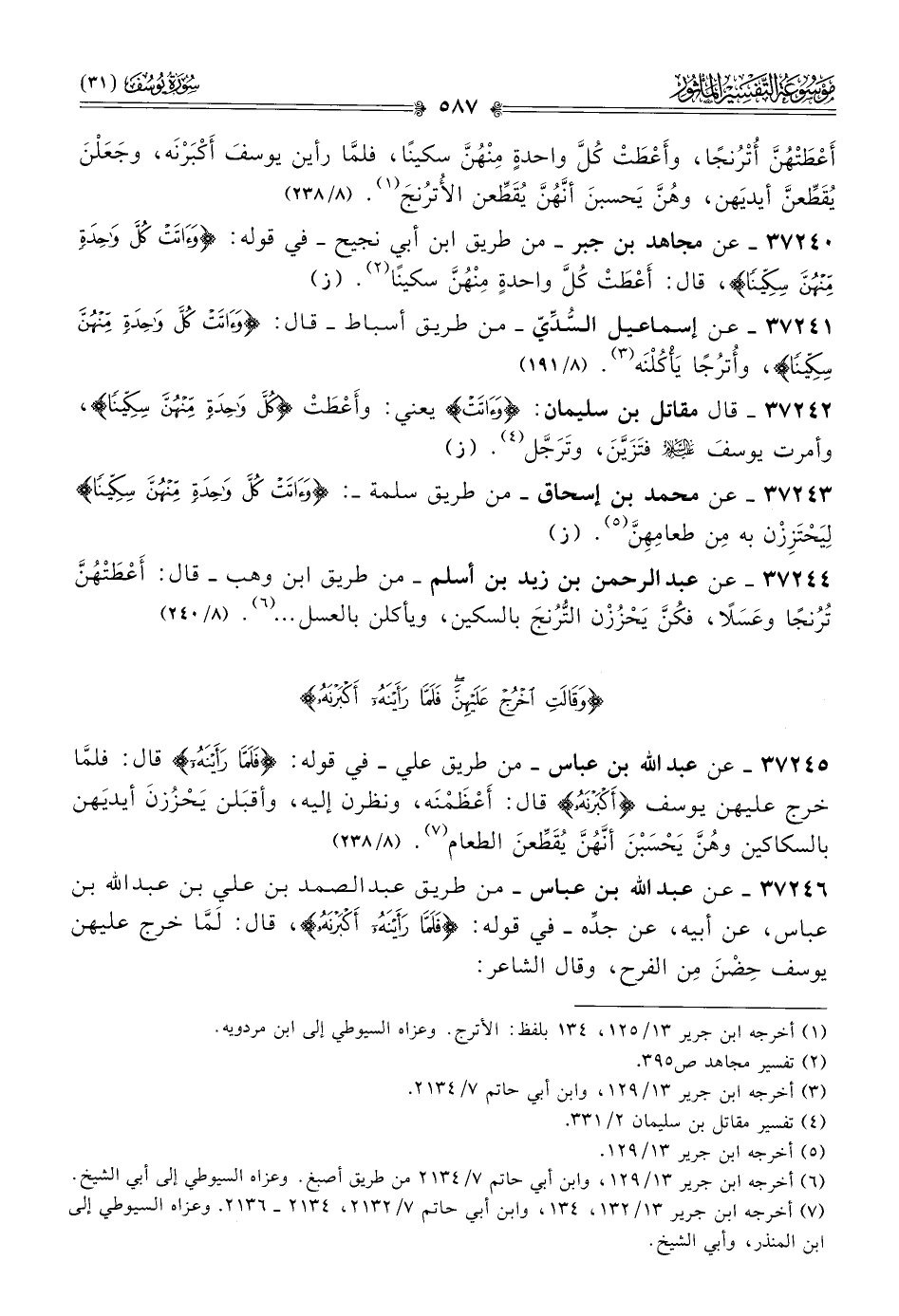 ٣٧٢٤٠ - عن مجاهد بن جبر -من طريق ابن أبي نجيح- في قوله: {وآتت كل واحدة منهن سكينا}، قال: أعْطَتْ كُلَّ واحدةٍ مِنهُنَّ سكينًا (¬٢). (ز)
