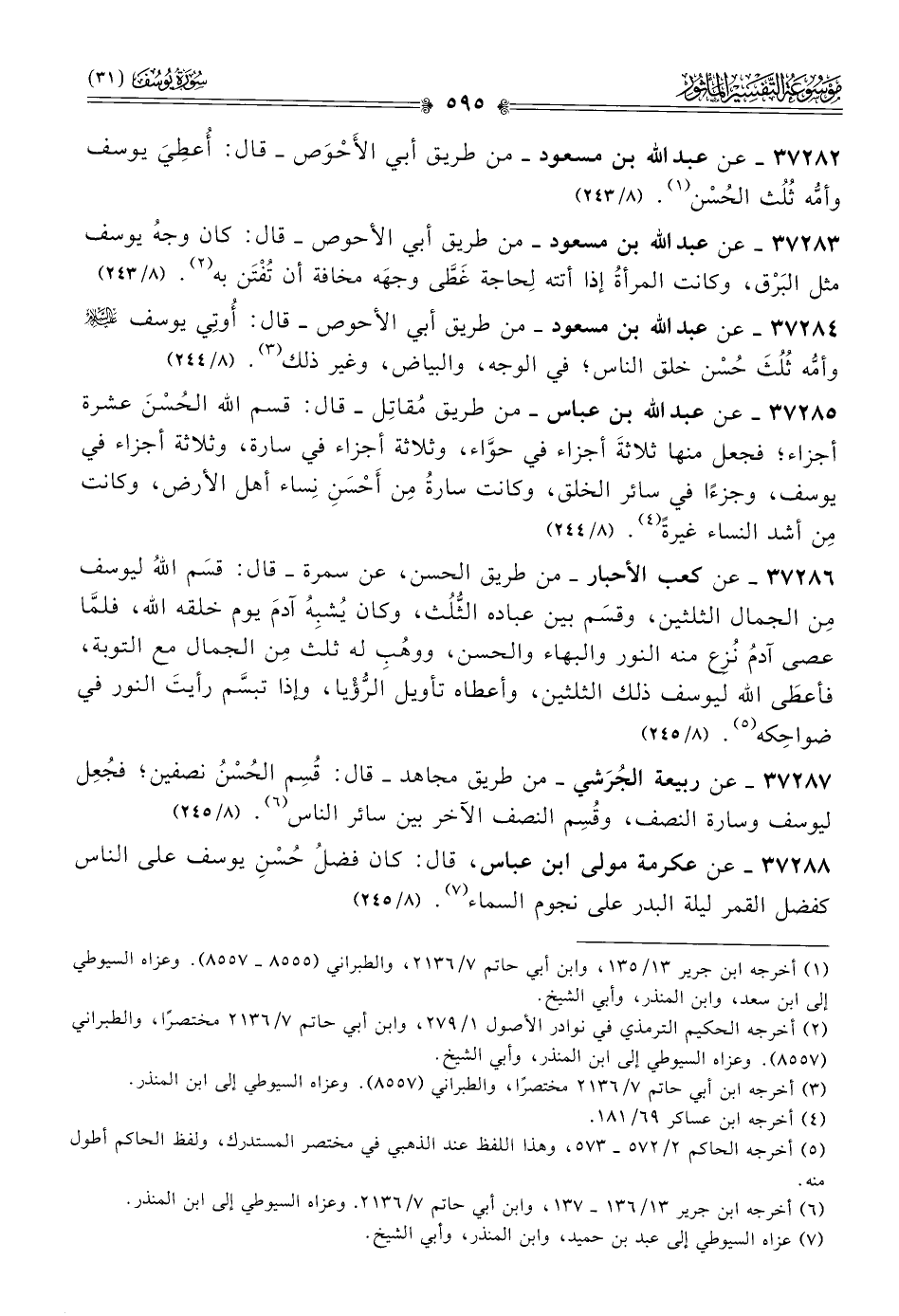 ٣٧٢٨٤ - عن عبد الله بن مسعود -من طريق أبي الأحوص- قال: أُوتِي يوسف - عليه السلام - وأمُّه ثُلُثَ حُسْن خلق الناس؛ في الوجه، والبياض، وغير ذلك (¬٣). (٨/ ٢٤٤)