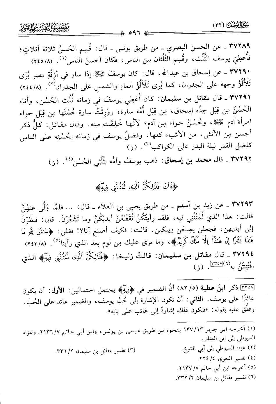 ٣٧٢٩٤ - قال مقاتل بن سليمان: قالتْ زليخا: {فذلكن الذي لمتنني فيه} الذي افْتُتِنتُنَّ به (¬٦) [٣٣٥٧]. (ز)