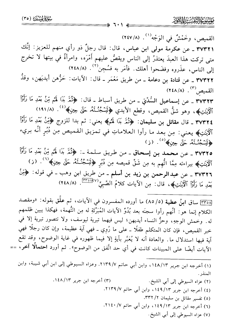 [٣٣٥٨] ساق ابنُ عطية (٥/ ٨٥) ما أورده المفسرون في الآيات، ثم علَّق بقوله: «ومقصد الكلام إنما هو: أنّهم رأوا سجنَه بعد بُدُوِّ الآيات المُبَرِّئَةِ له مِن التُّهمة، فهكذا يبين ظلمهم له. وخمش الوجهِ، وحزُّ النساء أيديهن؛ ليس فيهما تبرية ليوسف، ولا تتصور تبرية إلا في خبر القميص، فإن كان المتكلم طفلًا -على ما رُوِي- فهي آية عظيمة، وإن كان رجلًا فهي آية فيها استدلال ما. والعادة أنه لا يُعَبَّر بآيةٍ إلا فيما ظهوره في غاية الوضوح، وقد تقع الآيات أيضًا على المبينات كانت في أي حد اتَّفق من الوضوح». ثم أورد احتمالًا آخر، فقال: «ويحتمل أن يكون معنى قوله: {من بعد ما رأوا الآيات} أي: مِن بعد ما ظهر لهم مِن وجوه الأمر وقرائنه أنّ يوسف بريء، فلم يرد تعيين آية، بل قرائن جميع القصة».