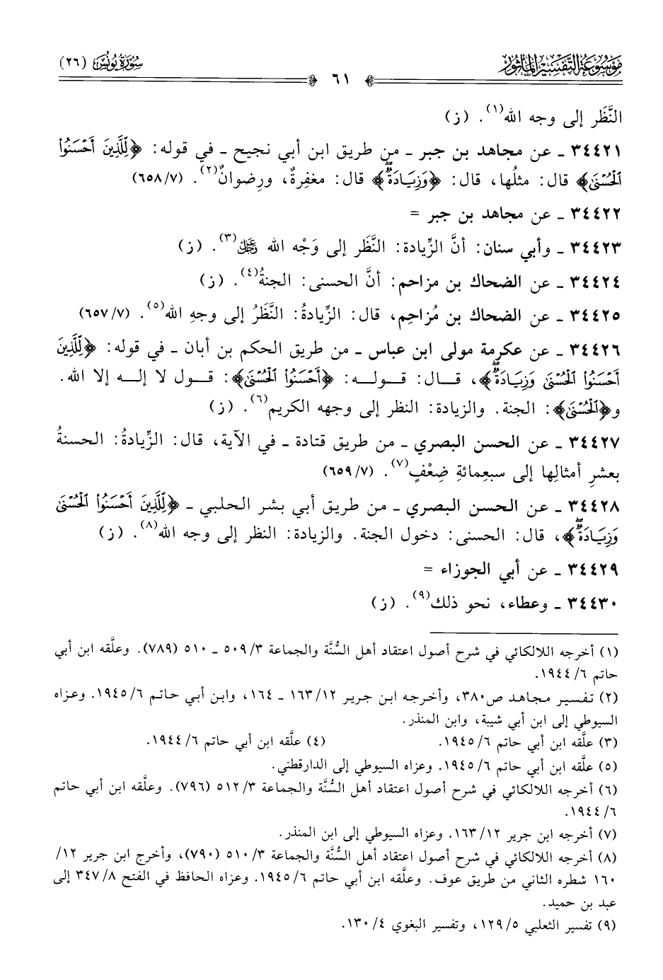٣٤٤٢٣ - وأبي سنان: أنّ الزِّيادة: النَّظَر إلى وجْه الله - عز وجل - (¬٣). (ز)