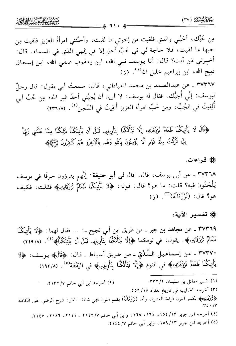 ٣٧٣٦٩ - عن مجاهد بن جبر -من طريق ابن أبي نجيح-: ... فقال لهما: {لا يأتيكما طعام ترزقانه}. يقول: في نومكما {إلا نبأتكما بتأويله قبل أن يأتيكما} (¬٤). (٨/ ٢٤٩)