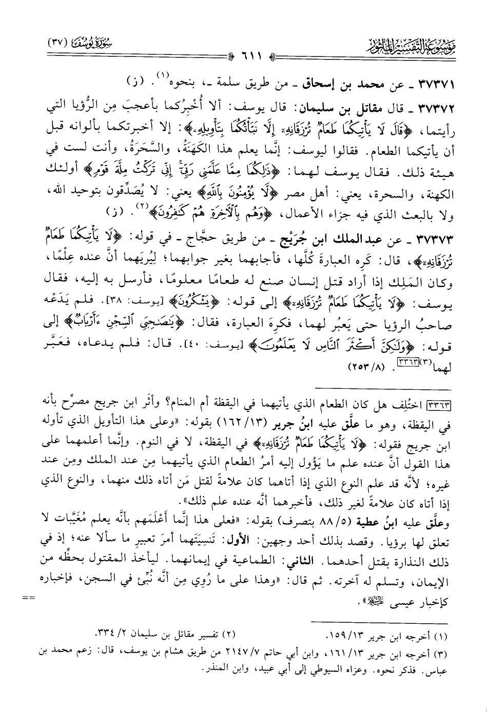 ٣٧٣٧٣ - عن عبد الملك ابن جُرَيْج -من طريق حجّاج- في قوله: {لا يأتيكما طعام ترزقانه}، قال: كَرِه العبارةَ كُلَّها، فأجابهما بغير جوابهما؛ لِيُريَهما أنّ عنده عِلْمًا، وكان المَلِك إذا أراد قتل إنسان صنع له طعامًا معلومًا، فأرسل به إليه، فقال يوسف: {لا يأتيكما طعام ترزقانه} إلى قوله: {يشكرون}. فلم يَدَعْه صاحبُ الرؤيا حتى يَعبُر لهما، فكرِهَ العبارة، فقال: {يا صاحبى السجن ءأرباب} إلى قوله: {ولكن أكثر الناس لا يعلمون}. قال: فلم يدعاه، فعَبَّر لهما (¬٣) [٣٣٦٣]. (٨/ ٢٥٣)