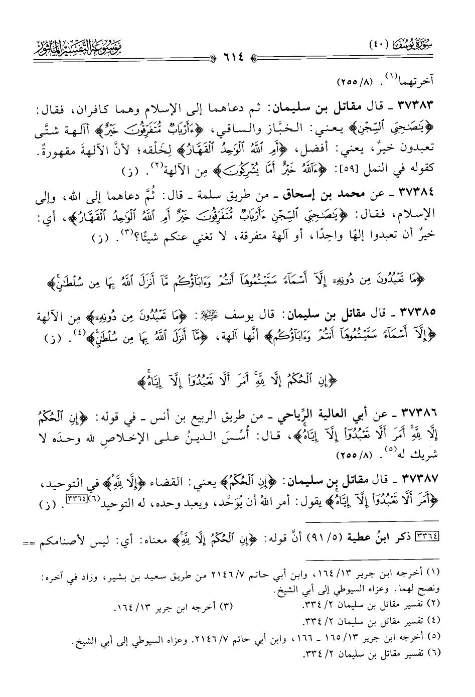 ٣٧٣٨٦ - عن أبي العالية الرِّياحي -من طريق الربيع بن أنس- في قوله: {إنِ الحُكم إلا لله أمَرَ ألا تعبدوا إلا إياه}، قال: أُسِّسَ الدينُ على الإخلاصِ لله وحدَه لا شريك له (¬٥). (٨/ ٢٥٥)