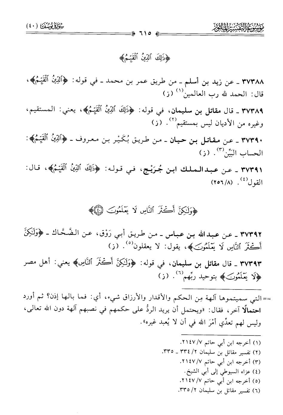 ٣٧٣٩٣ - قال مقاتل بن سليمان، في قوله: {ولكن أكثر الناس} يعني: أهل مصر {لا يعلمون} بتوحيد ربِّهم (¬٦). (ز)