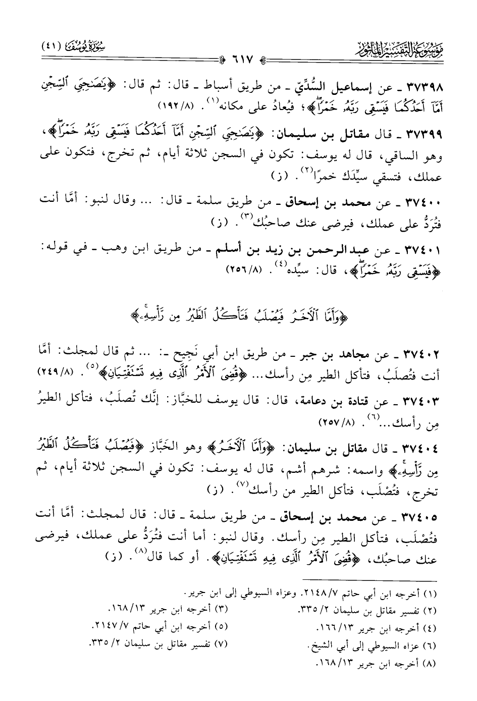 ٣٧٤٠٣ - عن قتادة بن دعامة، قال: قال يوسف للخبّاز: إنّك تُصلَبُ، فتأكل الطيرُ مِن رأسك ... (¬٦). (٨/ ٢٥٧)