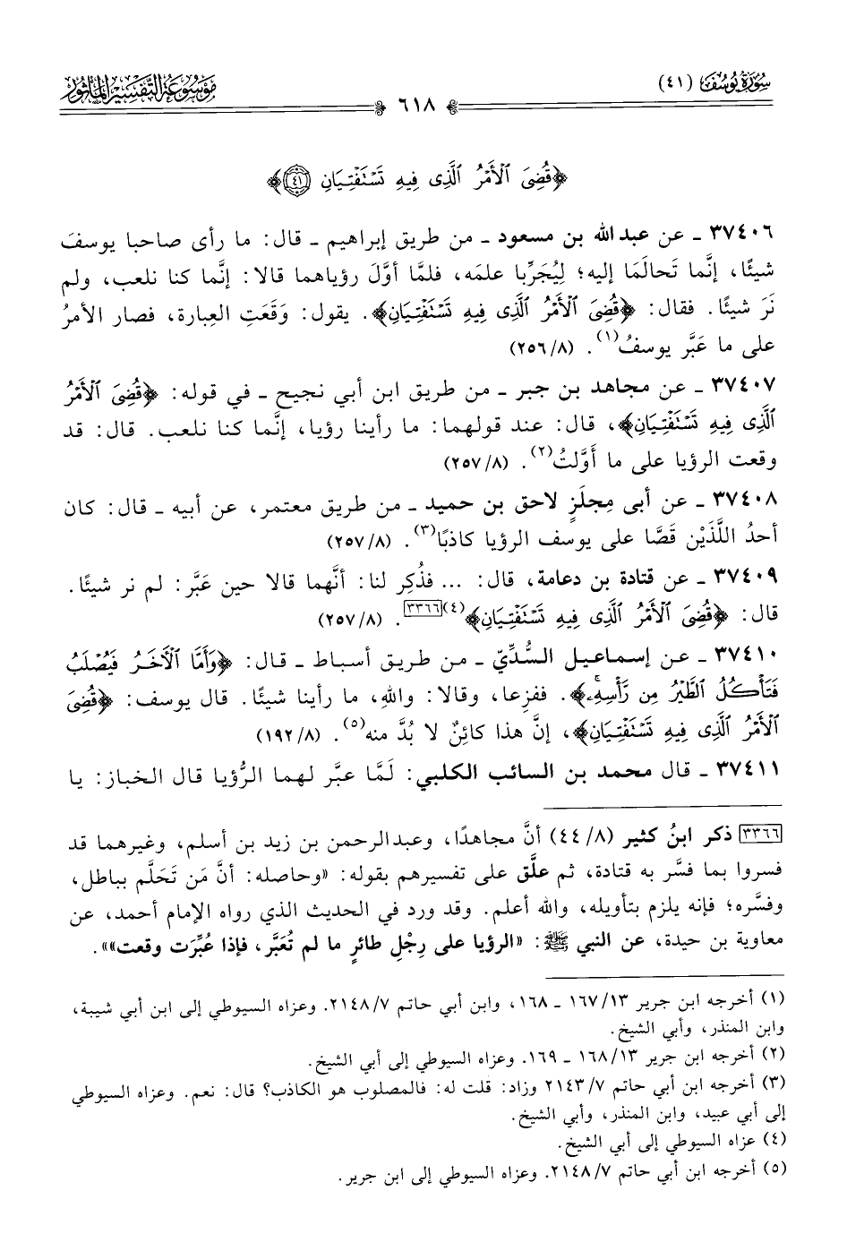 ٣٧٤٠٧ - عن مجاهد بن جبر -من طريق ابن أبي نجيح- في قوله: {قضى الأمر الذي فيه تستفتيان}، قال: عند قولهما: ما رأينا رؤيا، إنّما كنا نلعب. قال: قد وقعت الرؤيا على ما أوَّلتُ (¬٢). (٨/ ٢٥٧)