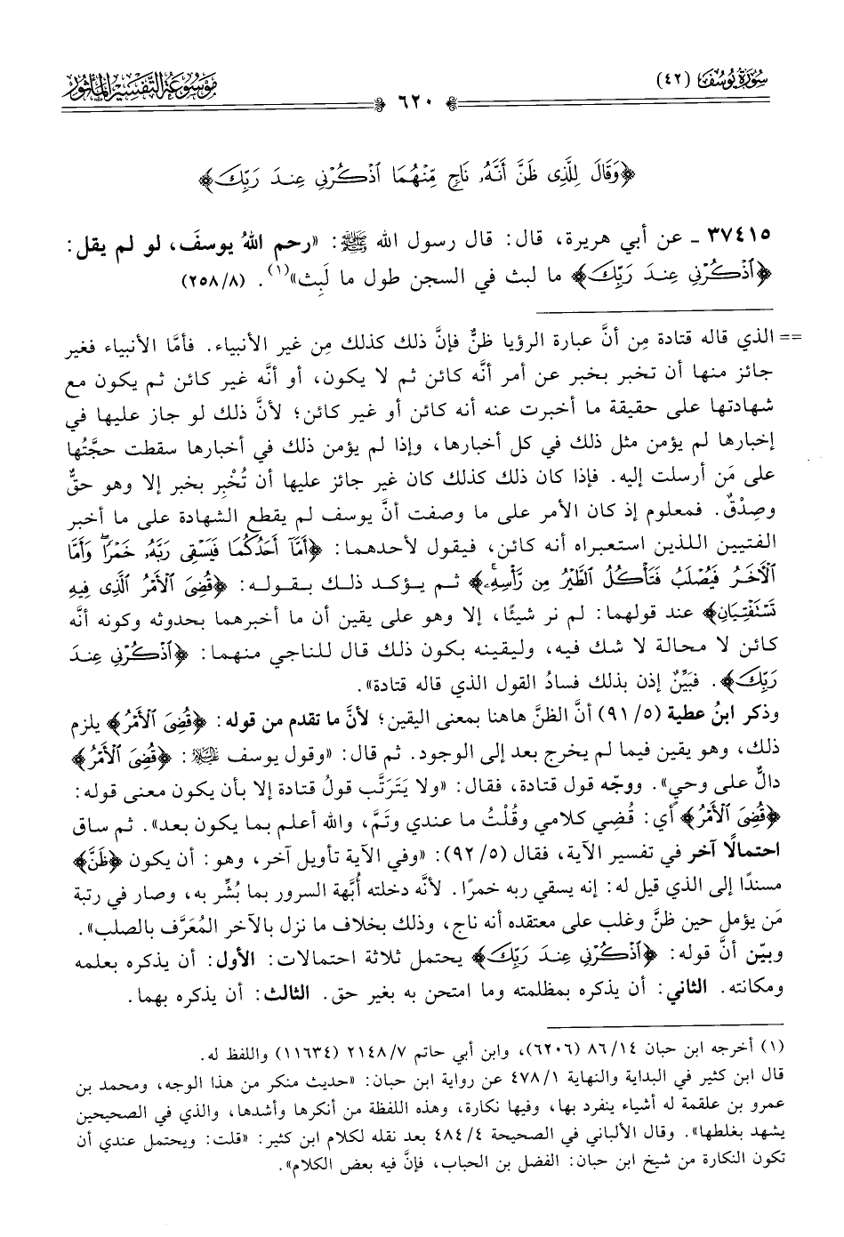 ٣٧٤١٥ - عن أبي هريرة، قال: قال رسول الله - صلى الله عليه وسلم -: «رحم اللهُ يوسفَ، لو لم يقل: {اذكرني عند ربك} ما لبث في السجن طول ما لَبِث» (¬١). (٨/ ٢٥٨)