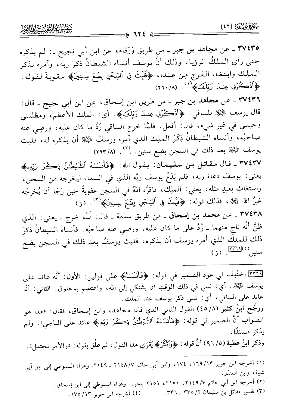 [٣٣٦٩] اختُلِف في عود الضمير في قوله: {فأنساه} على قولين: الأول: أنّه عائد على يوسف - عليه السلام -. أي: نسي في ذلك الوقتِ أن يشتكي إلى الله، واعتصم بمخلوق. الثاني: أنّه عائد على الساقي، أي: نسي ذكر يوسف عند الملك.