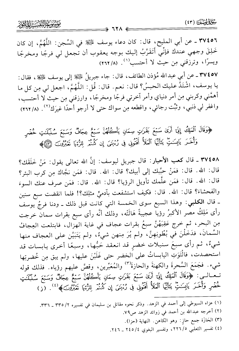 ٣٧٤٥٨ - قال كعب الأحبار: قال جبريل ليوسف: إنّ الله تعالى يقول: مَن خَلَقَك؟ قال: الله. قال: فمَن حبَّبك إلى أبيك؟ قال: الله. قال: فمَن نجّاك مِن كرب البئر؟ قال: الله. قال: فمَن علَّمك تأويل الرؤيا؟ قال: الله. قال: فمَن صرف عنك السوءَ والفحشاءَ؟ قال: الله. قال: فكيف استشفعت بآدميٍّ مثلِك؟! فلما انقضت سبع سنين -قال الكلبي: وهذا السبع سوى الخمسة التي كانت قبل ذلك- ودنا فرجُ يوسف رأى مَلِكُ مصر الأكبرُ رؤيا عجيبةً هالَتْه، وذلك أنّه رأى سبع بقرات سمان خرجت مِن البحر، ثم خرج عَقِبَهُنَّ سبعُ بقرات عجاف في غاية الهزال، فابتلعت العِجافُ السِّمانَ، فدَخَلْنَ في بُطُونِهِنَّ، ولم يُرَ مِنهن شيءٌ، ولم يَتَبَيَّن على العجاف منها شيءٌ، ثم رأى سبعَ سنبلات خضرٍ قد انعقد حَبُّها، وسبعًا أخرى يابسات قد استحصدت، فالتَوَتِ اليابساتُ على الخضر حتى غَلَبْنَ عليها، ولم يبق مِن خُضرتِها شيء. فجَمَعَ السَّحرةَ والكهنةَ والحازةَ (¬٣) والمُعَبِّرين، وقصَّ عليهم رؤياه. فذلك قوله تعالى: {وقال الملك إني أرى سبع بقرات سمان يأكلهن سبع عجاف وسبع سنبلات خضر وأخر يابسات يا أيها الملأ أفتوني في رؤياي إن كنتم للرؤيا تعبرون} (¬٤). (ز)
