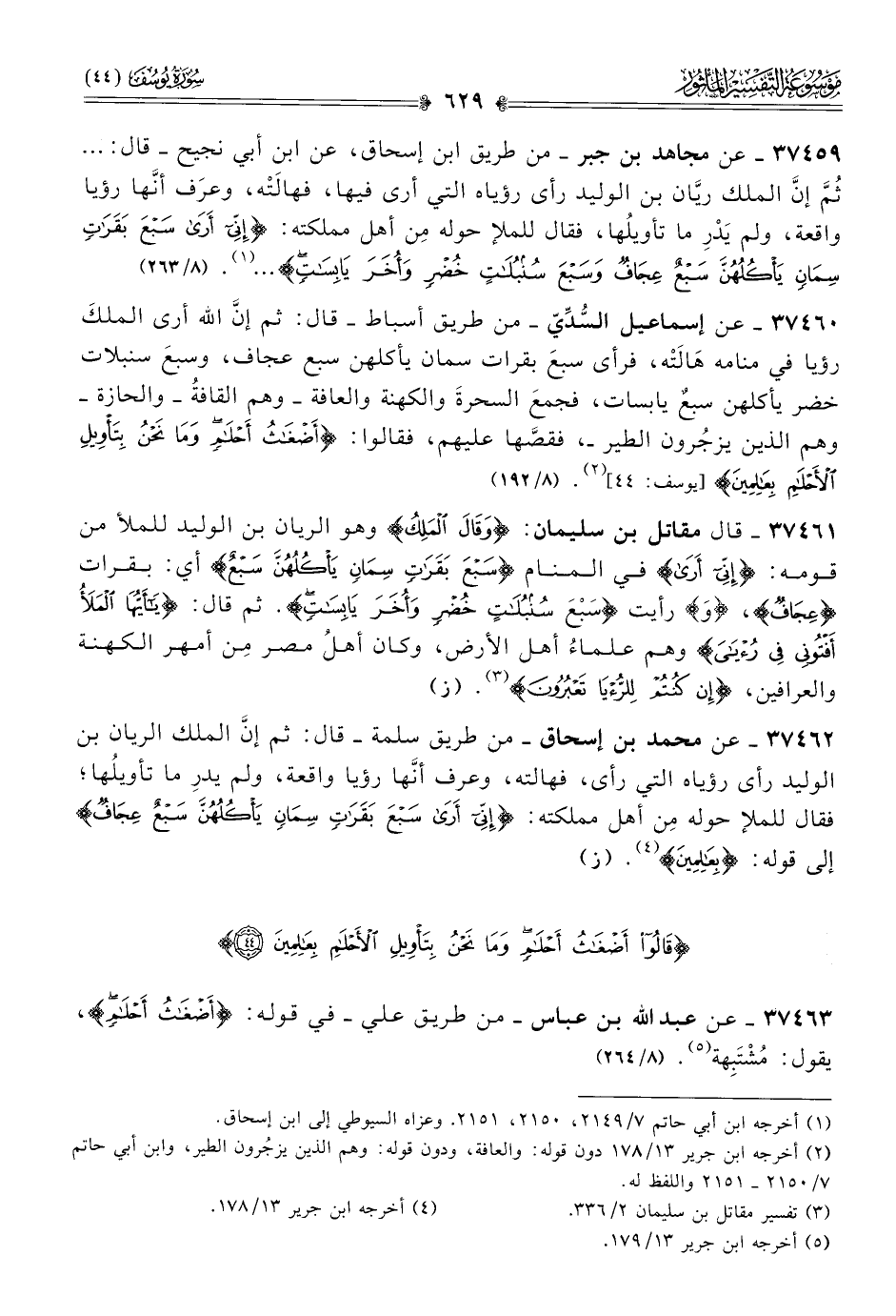 ٣٧٤٥٩ - عن مجاهد بن جبر -من طريق ابن إسحاق، عن ابن أبي نجيح- قال: ... ثُمَّ إنّ الملك ريّان بن الوليد رأى رؤياه التي أرى فيها، فهالَتْه، وعرَف أنّها رؤيا واقعة، ولم يَدْرِ ما تأويلُها، فقال للملإ حوله مِن أهل مملكته: {إني أرى سبع بقرات سمان يأكلهن سبع عجاف وسبع سنبلات خضر وأخر يابسات} ... (¬١). (٨/ ٢٦٣)