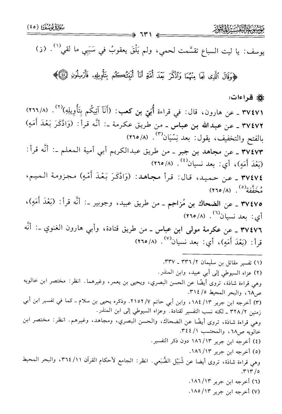 ٣٧٤٧٥ - عن الضحاك بن مُزاحِم -من طريق عبيد، وجوبير- أنّه قرأ: (بَعْدَ أمَهٍ)، أي: بعد نسيان (¬٦). (٨/ ٢٦٥)