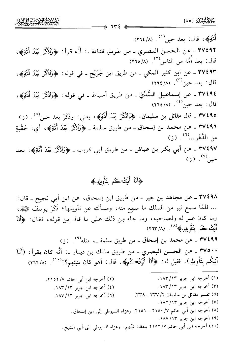 ٣٧٤٩٨ - عن مجاهد بن جبر -من طريق ابن إسحاق، عن ابن أبي نجيح- قال: ... فلمّا سمع نبو من الملك ما سمِع منه، ومسألته عن تأويلها؛ ذَكَرَ يوسفَ - عليه السلام -، وما كان عبر له ولصاحبه، وما جاء مِن ذلك على ما قال مِن قوله، فقال: {أنا أنبئكم بتأويله} (¬٨). (٨/ ٢٦٣)
