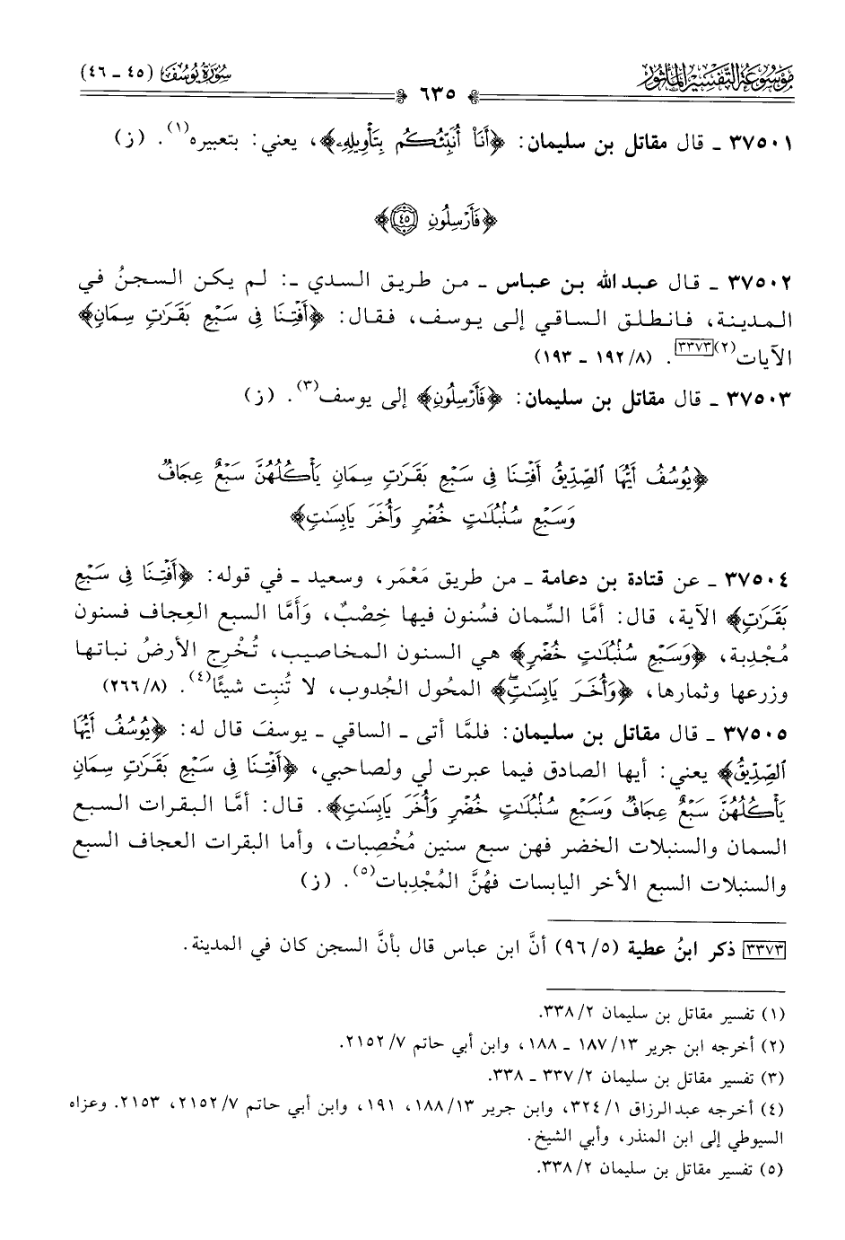 ٣٧٥٠٢ - قال عبد الله بن عباس -من طريق السدي-: لم يكن السجنُ في المدينة، فانطلق الساقي إلى يوسف، فقال: {أفتنا في سبع بقرات سمان} الآيات (¬٢) [٣٣٧٣]. (٨/ ١٩٢ - ١٩٣)