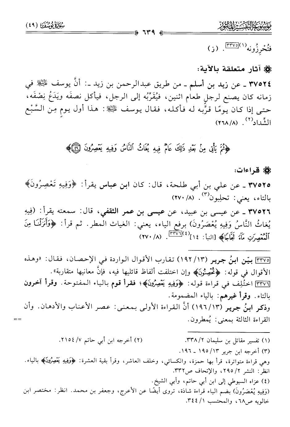 [٣٣٧٦] اختُلِف في قراءة قوله: {وفيه يعصرون}؛ فقرأ قوم بالياء المفتوحة. وقرأ آخرون بالتاء. وقرأ غيرهم: بالياء المضمومة.