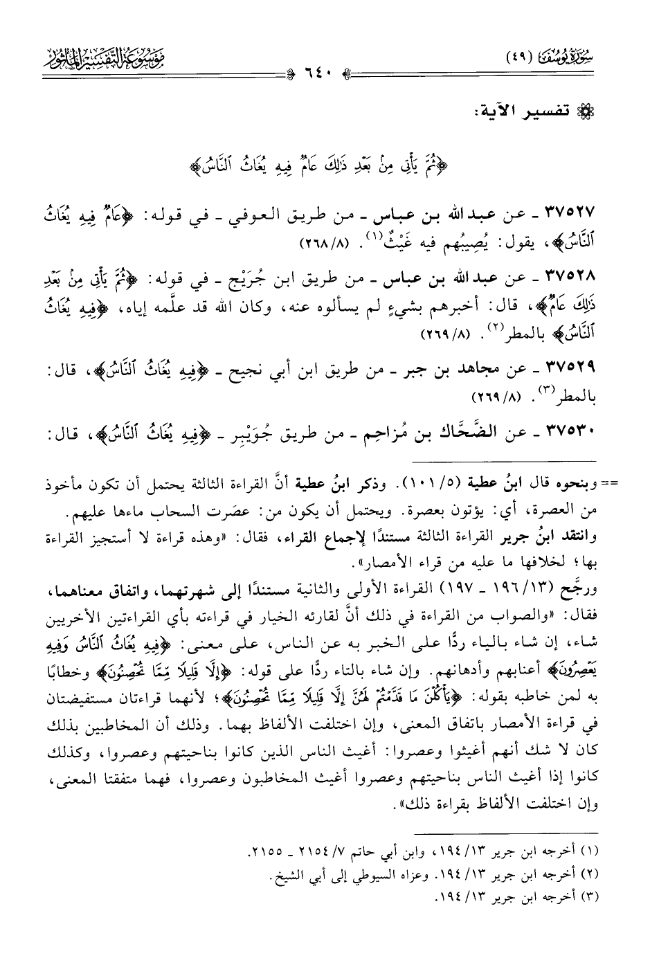 ٣٧٥٢٩ - عن مجاهد بن جبر -من طريق ابن أبي نجيح- {فيه يغاث الناس}، قال: بالمطر (¬٣). (٨/ ٢٦٩)