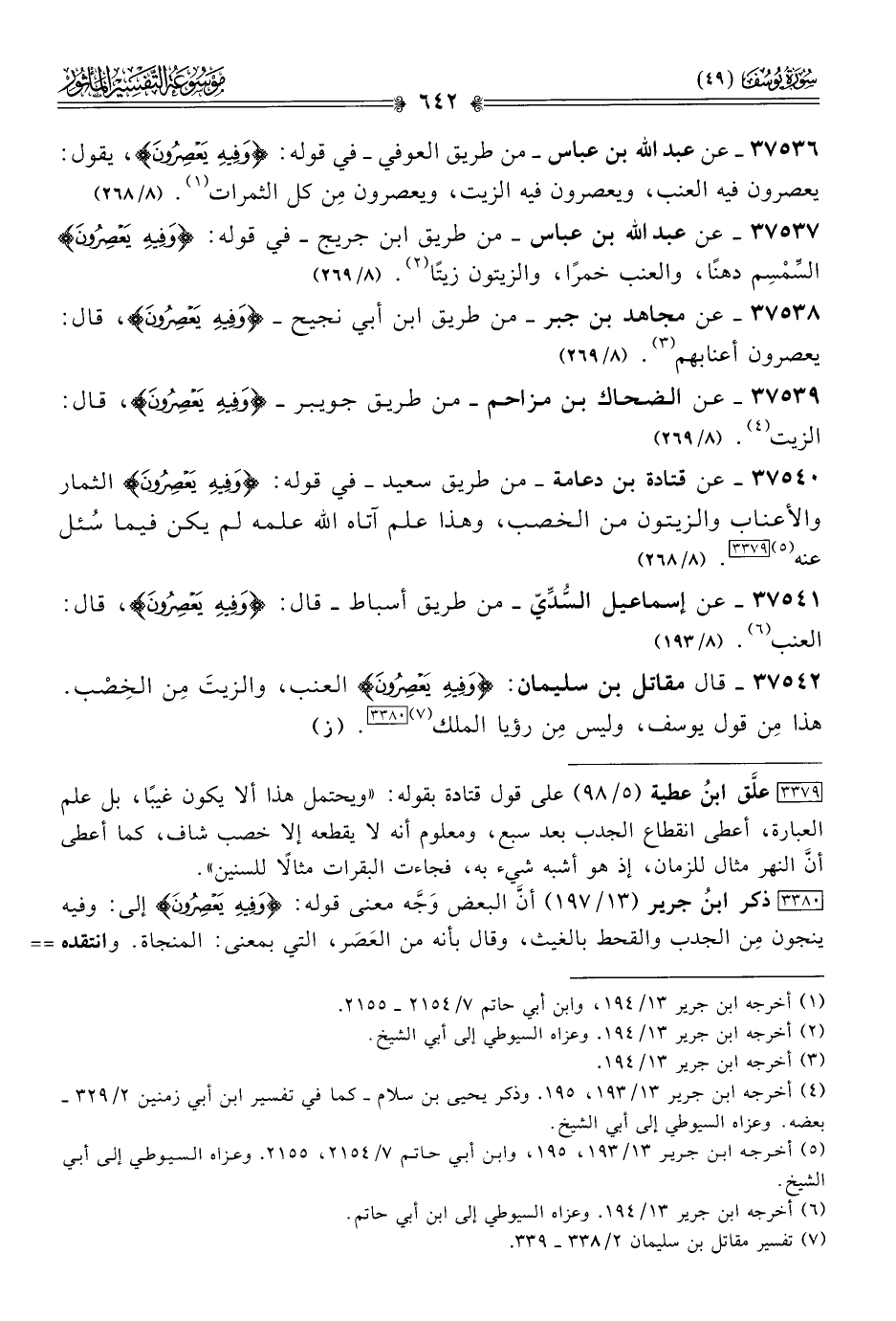 ٣٧٥٣٧ - عن عبد الله بن عباس -من طريق ابن جريج- في قوله: {وفيه يعصرون} السِّمْسِم دهنًا، والعنب خمرًا، والزيتون زيتًا (¬٢). (٨/ ٢٦٩)
