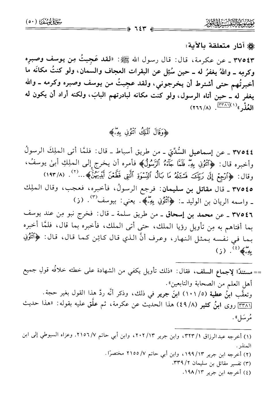 ٣٧٥٤٥ - قال مقاتل بن سليمان: فرجع الرسولُ، فأخبره، فعجب، وقال الملِك -واسمه الريان بن الوليد-: {ائتوني به}. يعني: بيوسف (¬٣). (ز)