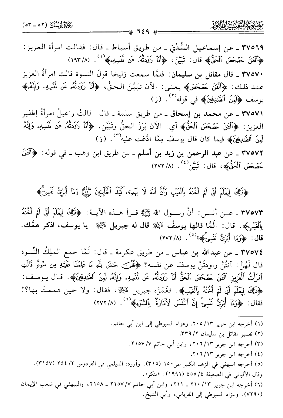 ٣٧٥٦٩ - عن إسماعيل السُّدِّيّ -من طريق أسباط- قال: فقالت امرأة العزيز: {الآن حصحص الحق} قال: تَبَيَّنَ، {أنا راودته عن نفسه} (¬١). (٨/ ١٩٣)