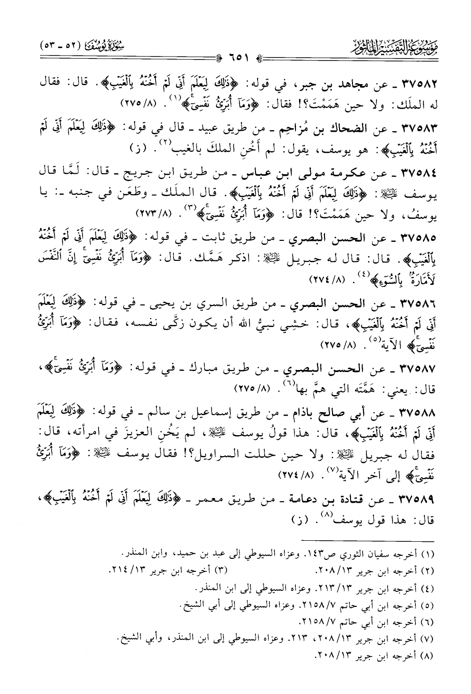 ٣٧٥٨٥ - عن الحسن البصري -من طريق ثابت- في قوله: {ذلك ليعلم أنى لم أخنه بالغيب}. قال: قال له جبريل - عليه السلام -: اذكر هَمَّك. قال: {وما أبرئ نفسى إن النفس لأمارة بالسوء} (¬٤). (٨/ ٢٧٤)