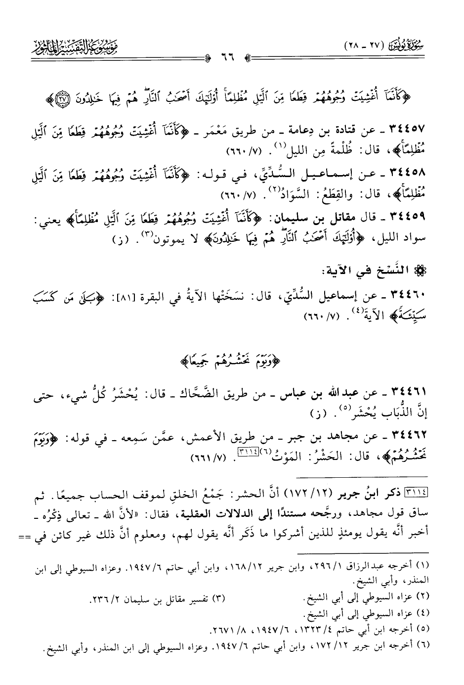 ٣٤٤٦٢ - عن مجاهد بن جبر -من طريق الأعمش، عمَّن سَمِعه- في قوله: {ويَومَ نَحْشُرُهُمْ}، قال: الحَشْرُ: المَوْتُ (¬٦) [٣١١٤]. (٧/ ٦٦١)