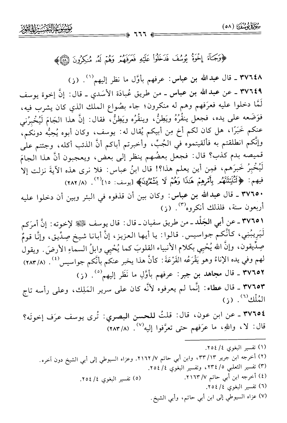 ٣٧٦٥٤ - عن ابن عون، قال: قلتُ للحسن البصري: تُرى يوسف عرَف إخوتَه؟ قال: لا، واللهِ، ما عرَفهم حتى تعرَّفوا إليه (¬٧). (٨/ ٢٨٣)