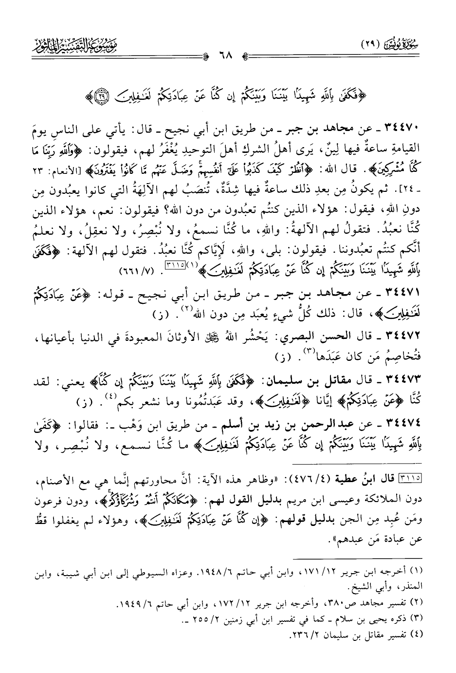 ٣٤٤٧٤ - عن عبد الرحمن بن زيد بن أسلم -من طريق ابن وهْب-: فقالوا: {كفى بالله شهيدا بيننا وبينكم إن كنا عن عبادتكم لغافلين} ما كُنّا نسمع، ولا نُبْصِر، ولا