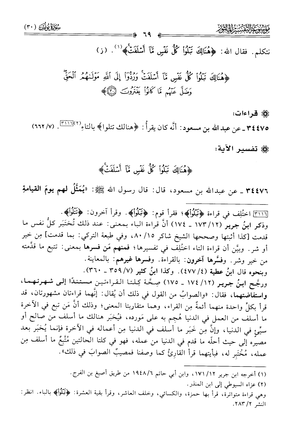 وذكر ابنُ جرير (١٢/ ١٧٣ - ١٧٤) أنّ قراءة الباء بمعنى: عند ذلك تُختَبَر كلُّ نفس ما قدمت [كذا أثبتها وصححها الشيخ شاكر ١٥/ ٨٠، وفي طبعة التركي: بما قدمت] مِن خير أو شر. وبيَّن أن قراءة التاء اختُلِف في تفسيرها؛ فمنهم مَن فسرها بمعنى: تتبع ما قدَّمته من خير وشر. وفسَّرها آخرون: بالقراءة. وفسرها غيرهم: بالمعاينة.