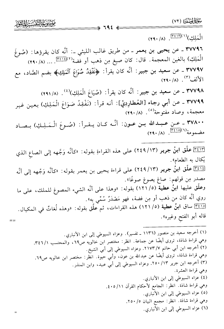 ٣٧٨٠٠ - عن عبد الله بن عون أنّه كان يقرأ: (صُوعَ المَلِكِ) بصاد مضمومة (¬٦) [٣٤١٥]. (٨/ ٢٩٠)