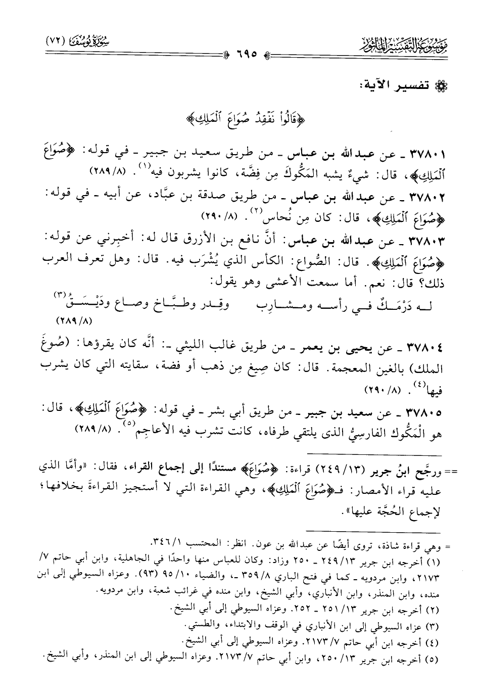 ٣٧٨٠١ - عن عبد الله بن عباس -من طريق سعيد بن جبير- في قوله: {صواع الملك}، قال: شيءٌ يشبه المَكُّوكَ مِن فِضَّة، كانوا يشربون فيه (¬١). (٨/ ٢٨٩)