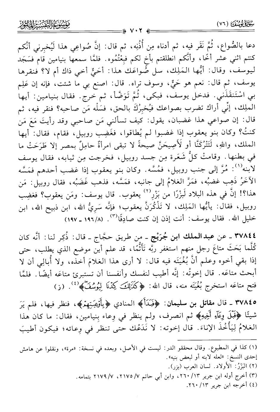 ٣٧٨٤٥ - قال مقاتل بن سليمان: {فَبَدَأَ} المنادي {بِأَوْعِيَتِهِمْ}، فنظر فيها، فلم يَرَ شيئًا {قَبْلَ وِعاءِ أخِيهِ} ثم انصرف، ولم ينظر في وِعاء بِنيامين، فقال: ما كان هذا الغلامُ لِيَأْخُذَ الإناءَ. قال إخوته: لا نَدَعُك حتى تنظر في وِعائه؛ فيكون أطيبَ