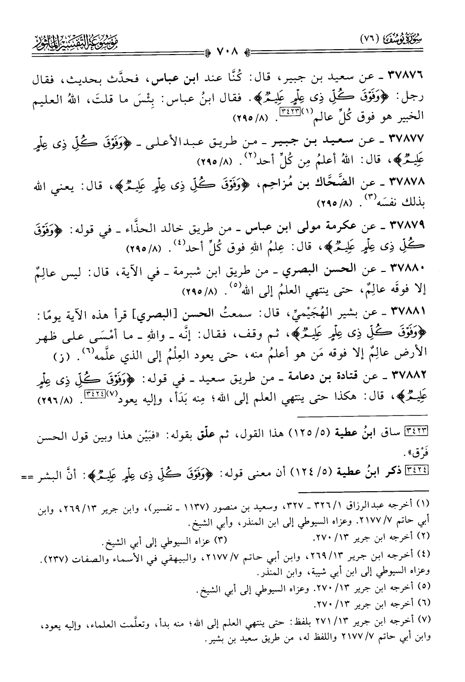 ٣٧٨٨٢ - عن قتادة بن دعامة -من طريق سعيد- في قوله: {وفوق كل ذي علم عليم}، قال: هكذا حتى ينتهي العلم إلى الله؛ مِنه بَدَأ، وإليه يعود (¬٧) [٣٤٢٤]. (٨/ ٢٩٦)