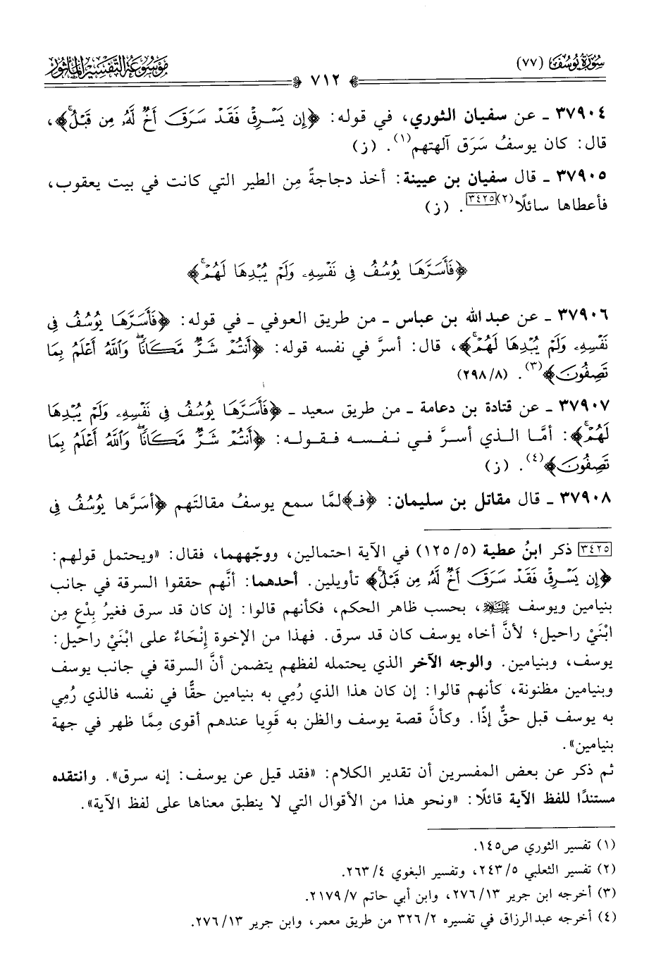 ٣٧٩٠٦ - عن عبد الله بن عباس -من طريق العوفي- في قوله: {فأسرها يوسف في نفسه ولم يبدها لهم}، قال: أسرَّ في نفسه قوله: {أنتم شر مكانًا والله أعلم بما تصفون} (¬٣). (٨/ ٢٩٨)