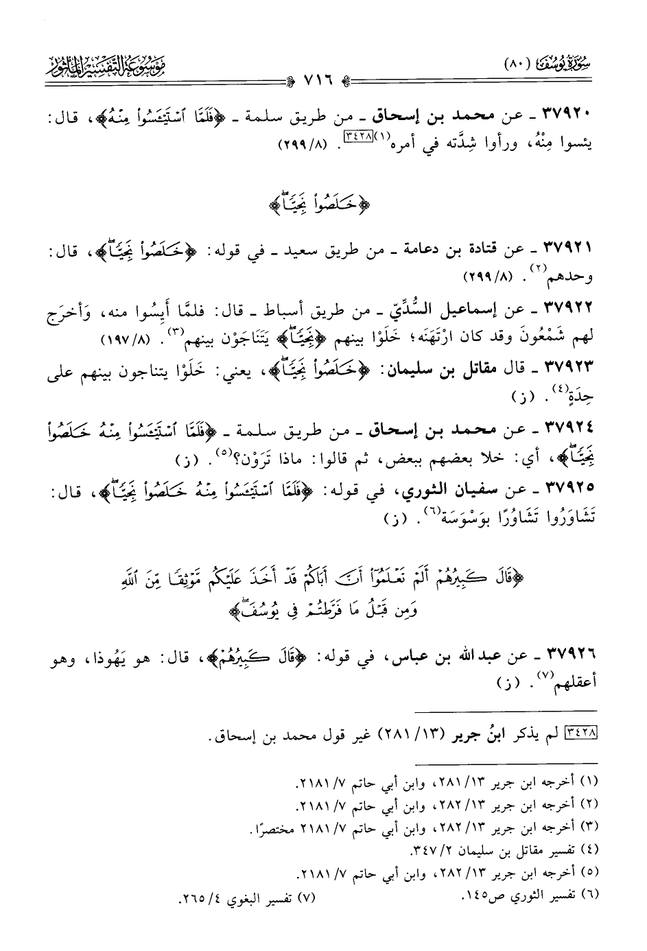 ٣٧٩٢٤ - عن محمد بن إسحاق -من طريق سلمة- {فلما استيأسوا منه خلصوا نجيا}، أي: خلا بعضهم ببعض، ثم قالوا: ماذا تَرَوْن؟ (¬٥). (ز)
