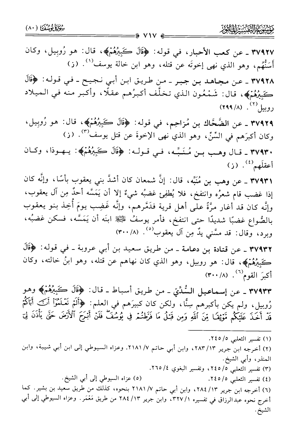 ٣٧٩٣٣ - عن إسماعيل السُّدِّيّ-من طريق أسباط- قال: {قال كبيرُهم} وهو رُوبيل، ولم يكن بأكبرهم سِنًّا، ولكن كان كبيرَهم في العلم: {ألم تعلموا أن أباكم قد أخذ عليكم موثقًا من الله ومن قبل ما فرطتم في يوسف فلن أبرح الأرض حتى يأذن لي