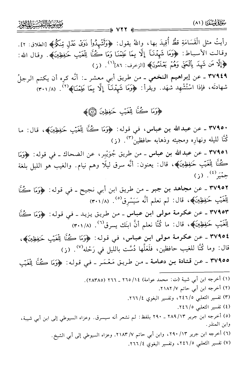 ٣٧٩٥٠ - عن عبد الله بن عباس، في قوله: {وما كنا للغيب حافظين}، قال: ما كُنّا لليله ونهارِه ومجيئه وذهابه حافظين (¬٣). (ز)