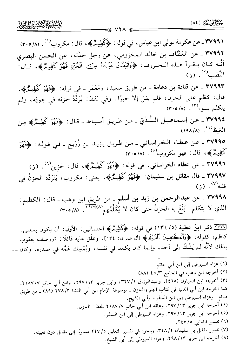 ٣٧٩٩٤ - عن إسماعيل السُّدِّيّ -من طريق أسباط- قال: {فهو كظيم} مِن الغيظ (¬٤). (٨/ ١٩٨)