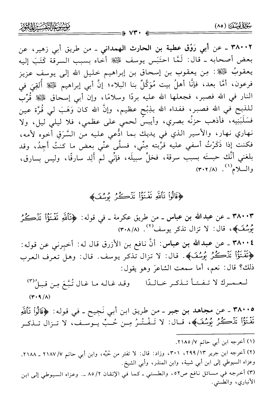 ٣٨٠٠٣ - عن عبد الله بن عباس -من طريق عكرمة- في قوله: {تالله تفتؤا تذكر يوسف}، قال: لا تزال تذكر يوسف (¬٢).