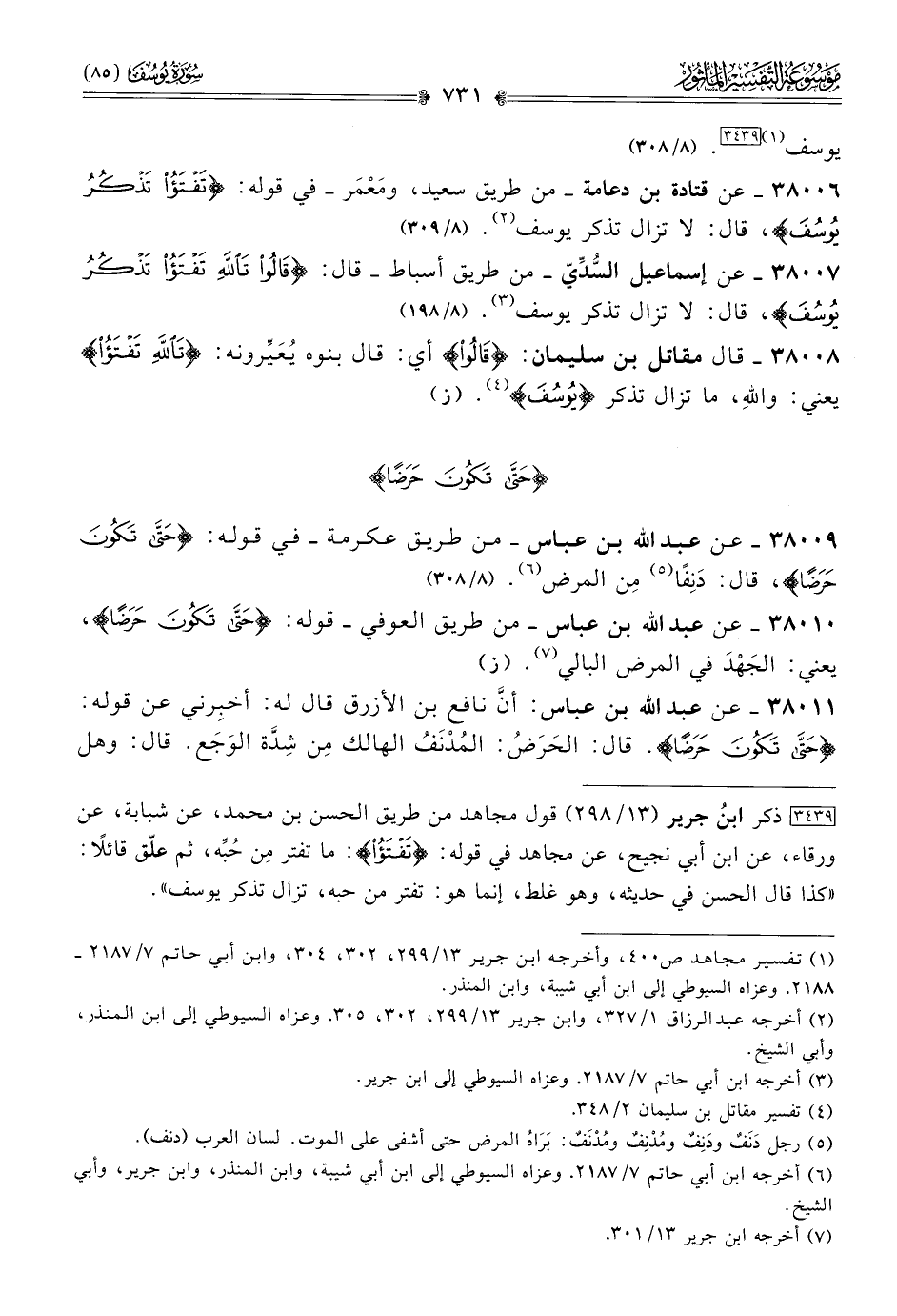 [٣٤٣٩] ذكر ابنُ جرير (١٣/ ٢٩٨) قول مجاهد من طريق الحسن بن محمد، عن شبابة، عن ورقاء، عن ابن أبي نجيح، عن مجاهد في قوله: {تفتأ}: ما تفتر مِن حُبِّه، ثم علّق قائلًا: «كذا قال الحسن في حديثه، وهو غلط، إنما هو: تفتر من حبه، تزال تذكر يوسف».