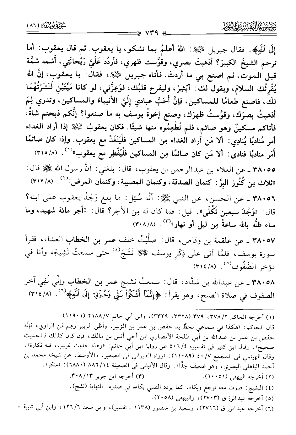 ٣٨٠٥٧ - عن علقمة بن وقاص، قال: صلَّيْتُ خلف عمر بن الخطاب العشاء، فقرأ سورة يوسف، فلمّا أتى على ذِكْرِ يوسف - عليه السلام - نَشَجَ (¬٤) حتى سمعتُ نَشِيجَه وأنا في مؤخر الصُّفُوف (¬٥). (٨/ ٣١٤)