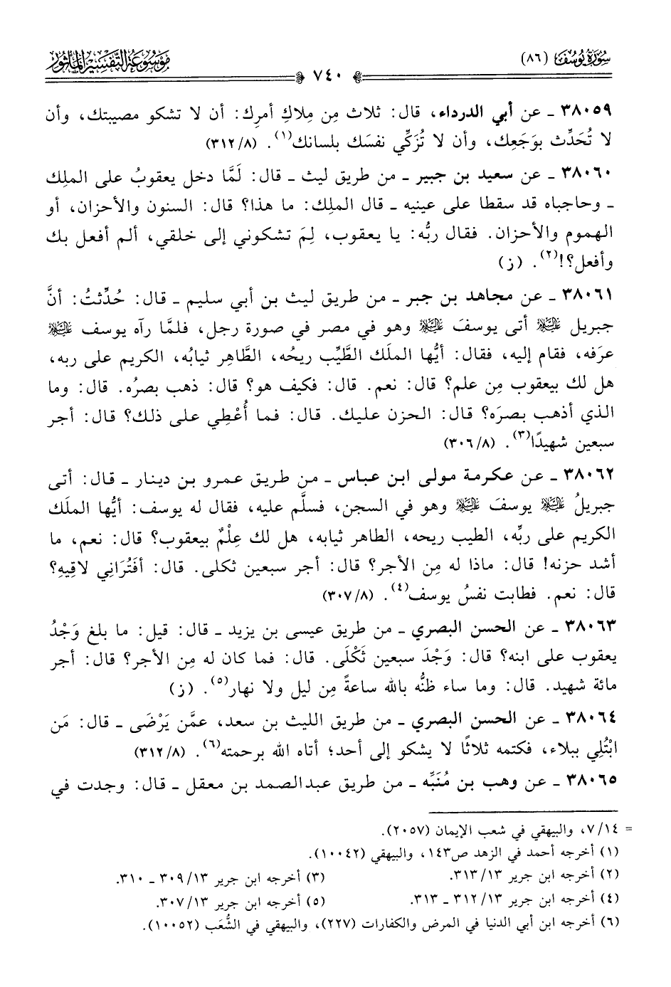 ٣٨٠٦٢ - عن عكرمة مولى ابن عباس -من طريق عمرو بن دينار- قال: أتى جبريلُ - عليه السلام - يوسفَ - عليه السلام - وهو في السجن، فسلَّم عليه، فقال له يوسف: أيُّها الملَك الكريم على ربِّه، الطيب ريحه، الطاهر ثيابه، هل لك عِلْمٌ بيعقوب؟ قال: نعم، ما أشد حزنه! قال: ماذا له مِن الأجر؟ قال: أجر سبعين ثكلى. قال: أفَتُرانِي لاقِيهِ؟ قال: نعم. فطابت نفسُ يوسف (¬٤). (٨/ ٣٠٧)