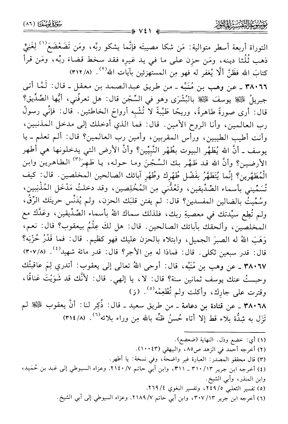 ٣٨٠٦٦ - عن وهب بن مُنَبِّه -من طريق عبد الصمد بن معقل- قال: لَمّا أتى جبريلُ - عليه السلام - يوسفَ - عليه السلام - بالبُشْرى وهو في السِّجْن قال: هل تعرفُني، أيُّها الصِّدِّيق؟ قال: أرى صورةً طاهرةً، وريحًا طَيِّبةً لا تُشْبِه أرواحَ الخاطئين. قال: فإنِّي رسولُ رب العالمين، وأنا الروح الأمين. قال: فما الذي أدخلك إلى مدخل المذنبين، وأنت أطيب الطيبين، ورأس المقربين، وأمين رب العالمين؟ قال: ألم تعلم -يا يوسف- أنّ الله يُطَهِّر البيوت بطُهْر النَّبِيِّين؟ وأنّ الأرض التي يدخلونها هي أطهر الأرضين؟ وأنّ الله قد طَهَّر بك السِّجْنَ وما حوله، يا طَهِرَ (¬٣) الطاهرين وابن المُطَهَّرين؟ إنّما يُتَطَهَّرُ بفَضْل طُهْرِك وطُهْرِ آبائك الصالحين المخلصين. قال: كيف تُسَمِّيني بأسماء الصِّدِّيقين، وتَعُدُّني مِن المُخْلِصين، وقد دخلتُ مَدْخَل المُذْنِبين، وسُمِّيتُ بالضالين المفسدين؟ قال: لم يفتن قلبَك الحزن، ولم يُدَنِّس حريتَك الرِّقُ، ولم تُطِع سيِّدتك في معصيةِ ربك، فلذلك سماك اللهُ بأسماء الصِّدِّيقين، وعَدَّك مع المخلصين، وألحقك بآبائك الصالحين. قال: هل لكَ عِلْمُ بيعقوب؟ قال: نعم، وهَبَ اللهُ له الصبرَ الجميل، وابتلاه بالحزن عليك فهو كظيم. قال: فما قَدْرُ حُزْنِه؟ قال: قدر سبعين ثكلى. قال: فماذا له مِن الأجر؟ قال: قدر مائة شهيد (¬٤). (٨/ ٣٠٧)
