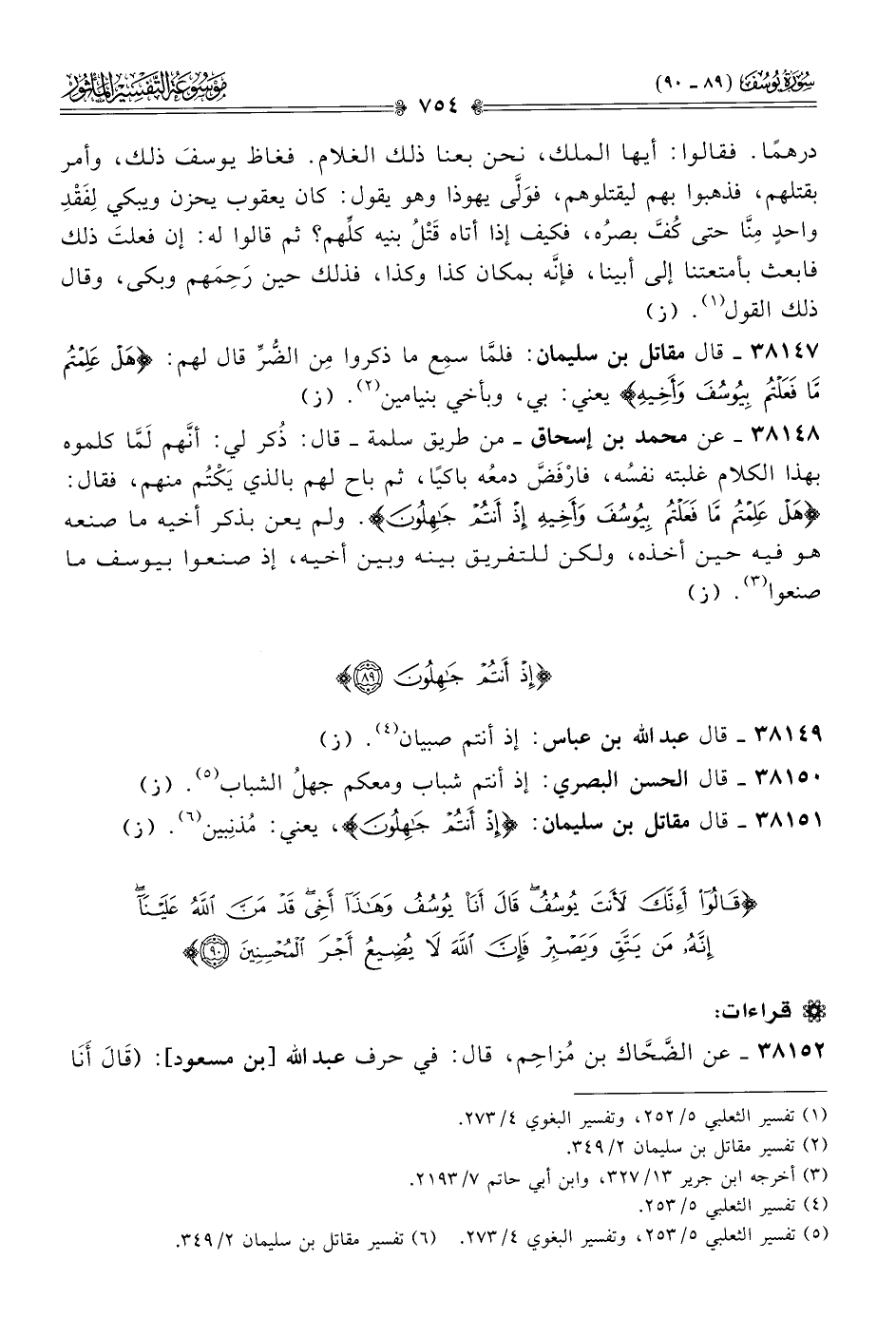 ٣٨١٤٧ - قال مقاتل بن سليمان: فلمّا سمِع ما ذكروا مِن الضُّرِّ قال لهم: {هل علمتم ما فعلتم بيوسف وأخيه} يعني: بي، وبأخي بنيامين (¬٢). (ز)