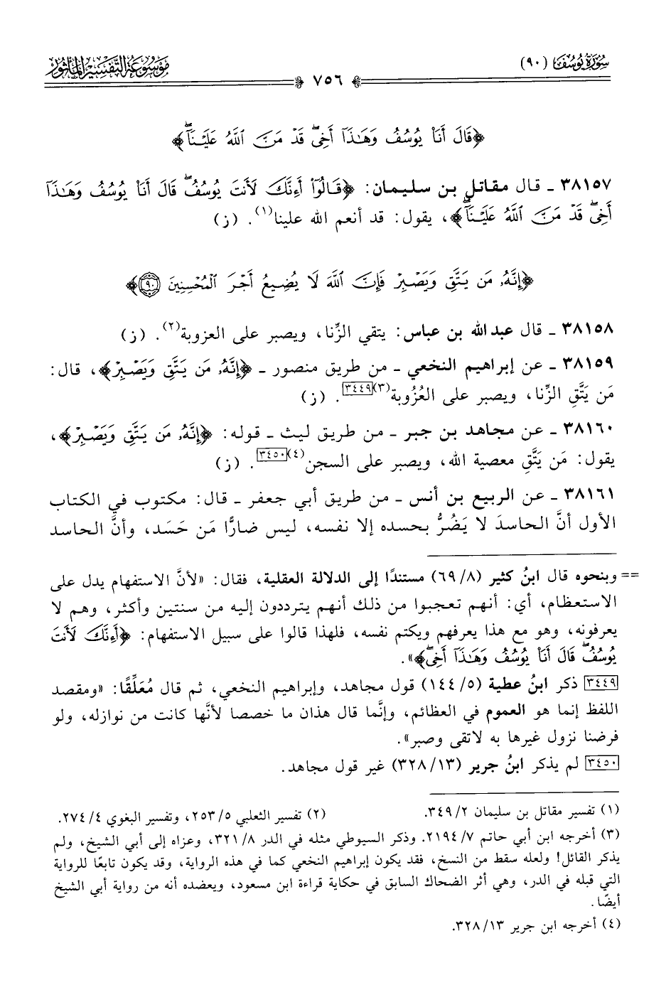٣٨١٥٩ - عن إبراهيم النخعي -من طريق منصور- {إنه من يتق ويصبر}، قال: مَن يَتَّقِ الزِّنا، ويصبر على العُزُوبة (¬٣) [٣٤٤٩]. (ز)