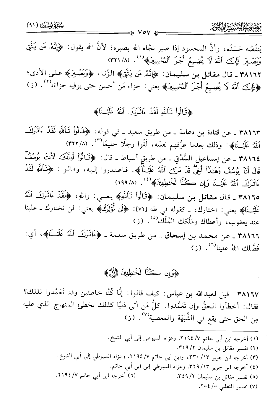 ٣٨١٦٤ - عن إسماعيل السُّدِّيّ -من طريق أسباط- قال: {قالوا: أءِنك لأنت يوسف قال: أنا يوسف وهذا أخى قد مَنَّ الله علينا}. فاعتذروا إليه، وقالوا: {تالله لقد آثرك الله علينا وإن كنا لخاطئين} (¬٤). (٨/ ١٩٩)